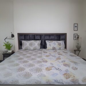"Unveil Elegance and Comfort with Our 100% Cotton Queen Size Bedsheet – Grey & White Leaf Print.